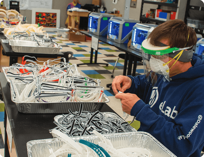 PEF leads the development of a 3D printer farm through VW eLabs that results in 7,200 face shields donated to front line workers at the onset of the pandemic.